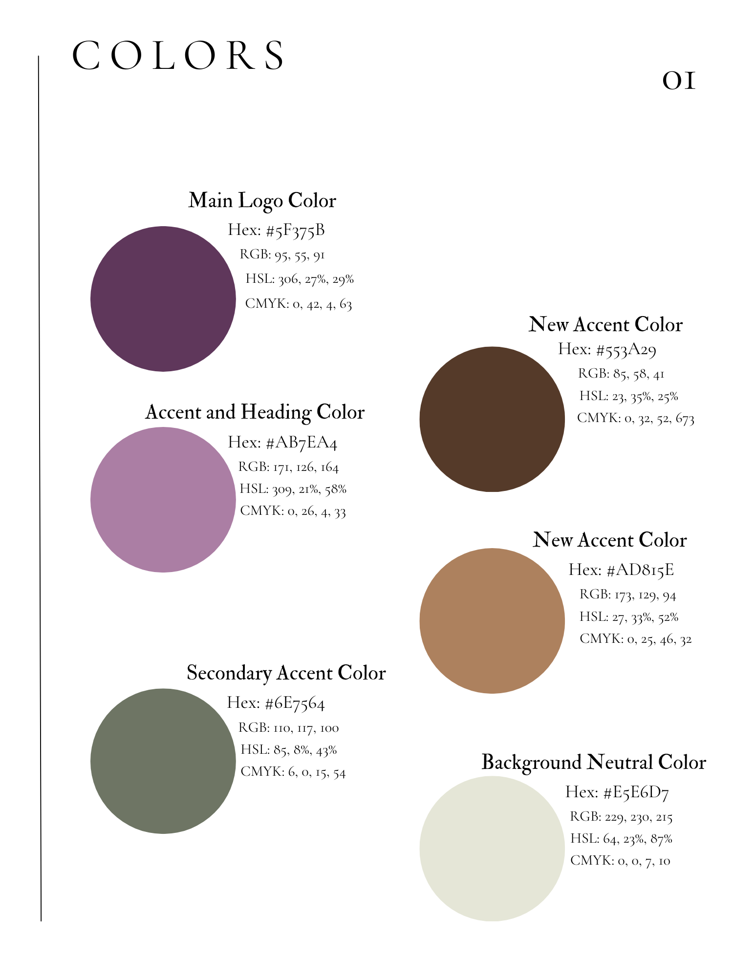 In my Brand Guide delivered to Kellyn during the project, I clearly laid out the colors alongside their uses and colors codes, so she could use them in future projects as well as clearly explain to any other designers that might work with her in the future.