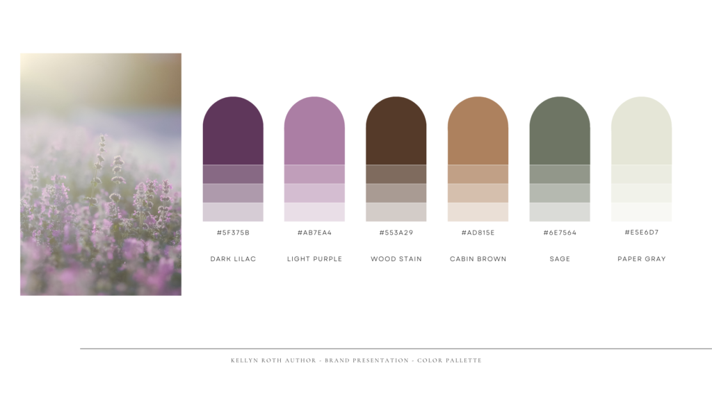 Kellyn had some color suggestions and a general design aesthetic in mind. She already had two purple colors in use on her website and graphics. She wanted to incorporate more of a rustic color palette that would meld well together with current image colors and the purple brand colors.